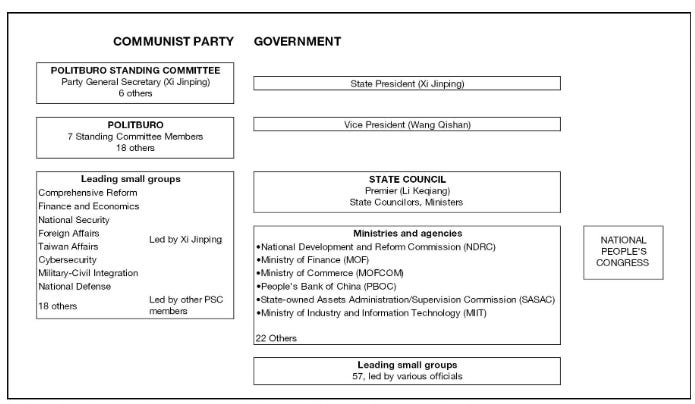 At the top of the pyramid of Chinese power sits the standing committee of the party’s Politburo. This group, which at present consists of seven members, is the nation’s core leadership, and the most important decisions require consensus within this group—although of course the views of the top leader carry a lot of weight. The standing committee sits inside the broader, twenty-five-member Politburo, which meets several times a year and ratifies many major decisions. Next in line below the Politburo are the “leading small groups” (LSGs), which the party and government organize to coordinate policy on major issues. Membership in these groups typically includes a range of officials holding government or party posts in a variety of agencies.