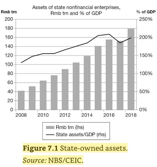 China remains an extraordinarily state-dominated economy in which SOEs [state-owned enterprises] command a far larger share of national assets than they do in other countries, and the vast majority of large firms in almost every economic sector are state-run … [P]rivate firms are, on average, small. The overwhelming majority of the largest companies in China are state-owned, and state firms dominate most capital-intensive sectors. The state sector’s share of national assets is far larger than in any other major economy.