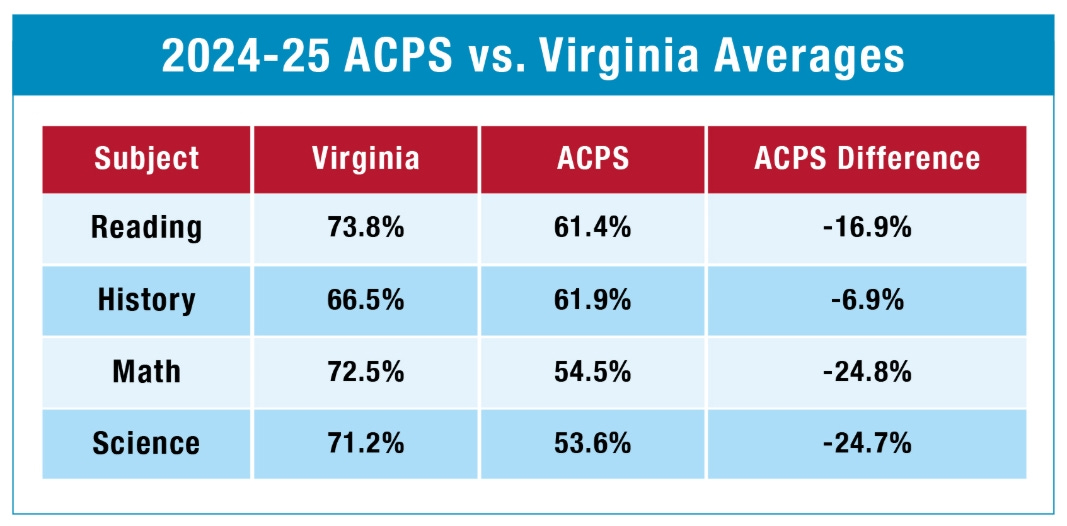 ACPS achievement still trails significantly behind the average Virginia school district in four of the five categories, which are reading, writing, history/social studies, math and science. ACPS scores are also well below the district’s performance during the 2018-2019 school year, which was the last full year prior to the COVID- 19 pandemic … While ACPS matched the statewide SOL score in writing, with a 65% pass rate, Alexandria continues to lag significantly behind Virginia’s average pass rates in the other four subjects. The widest disparity was in math, where Alexandria’s 53% pass rate lagged 23% behind the overall Virginia math pass rate, which was 69% during the 2022-23 school year. Alexandria’s reading pass rate was 60%, which is 17.8% lower than the Virginia pass rate of 73%.